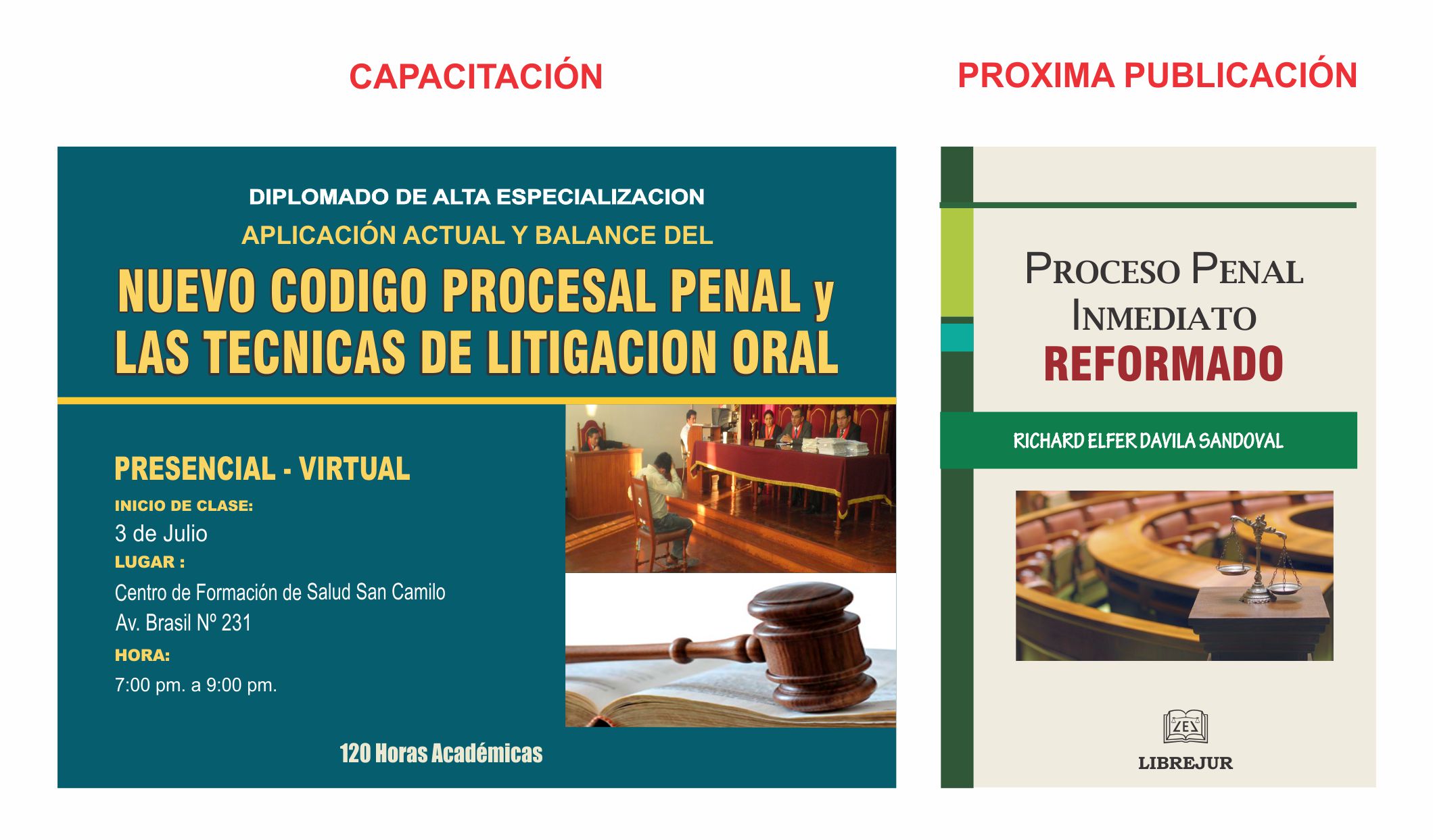 La Institución Académica LIBREJUR asumiendo el rol que le corresponde, en esta oportunidad presenta a la Comunidad Jurídica el Diplomado: APLICACIÓN ACTUAL Y BALANCE DEL NUEVO CODIGO PROCESAL PENAL Y LAS TECNICAS DE LITIGACION ORAL, el mismo que se encuentran dirigido al estudio, análisis y conocimiento de las principales instituciones que comprende esta interesante Materia Jurídica.